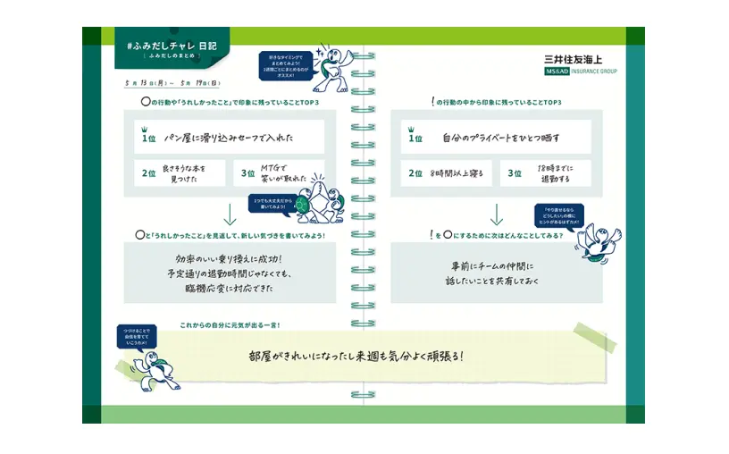 きりのいいタイミングで #ふみだしチャレ 日記を振り返って、まとめを書いてみよう。文字に書いて挑戦を振り返ると、うまくいったことや新しいやり方など、嬉しい発見が見つかるはず!