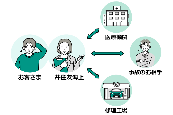 お相手から修理費や治療費などを直接請求された場合は、その場で賠償のお約束はせず、担当までご連絡ください。