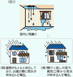 雹 、砂塵 その他これらに類するものの吹込みや漏入による損害(注2) - 保険の対象のすり傷、かき傷、塗料のはがれ落ち、ゆがみ、たわみ、へこみその他外観上の損傷(釘浮き、ひび割れ、はがれ、ずれ等を含みます。)または汚損(落書きを含みます。)であって、保険の対象の機能の喪失または低下を伴わない損害