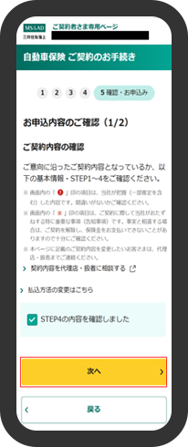 選択していただいた基本情報・STEP1~4を再度ご確認いただき、各チェック項目にチェック入力後、「次へ」を押下します。