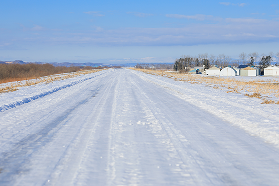 道路に積もった雪が何台もの自動車が通るうちに踏み固められ、硬く圧縮された状態になったものを「圧雪アイスバーン(圧雪路)」と呼びます。3種類のアイスバーンの中では比較的滑りにくいですが、雨で路面が濡れたり、日が差して表面の雪が解け出したりすることで滑りやすくなるので、注意を怠ってはいけません。
