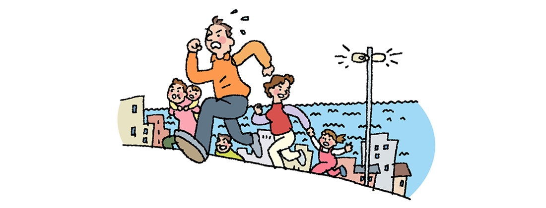 津波の被害にあわないために重要なポイントは「あらかじめ避難場所・より高い場所など安全な場所を把握しておき、大丈夫だと思ってもまずは逃げること」。もし避難した結果なにも起こらなかったとしても、その経験はいざというときの予行演習になります。家族や周囲の人ともこの意識を共有して、みんなで「とにかく逃げる」ように心がけましょう。