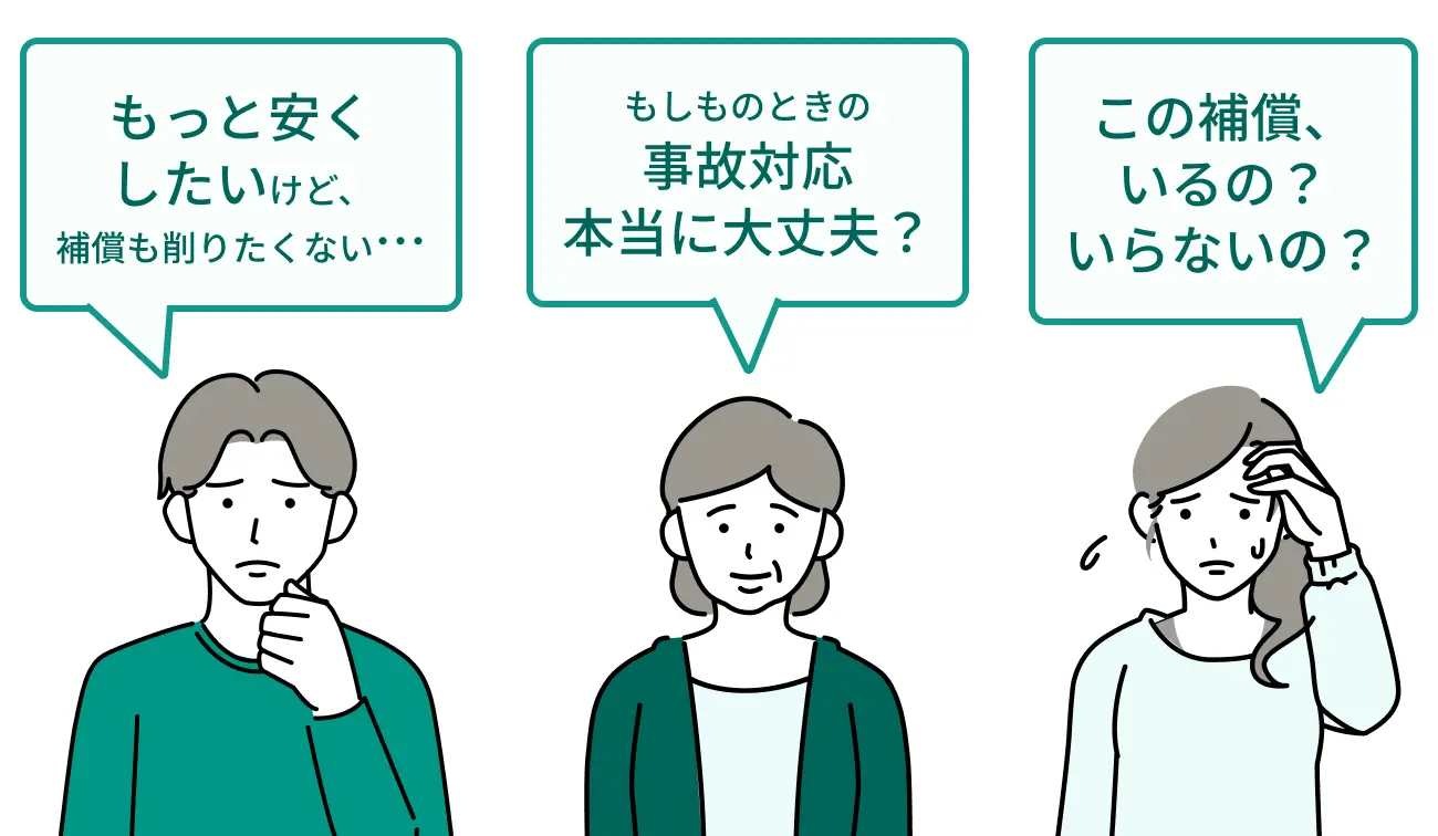 自動車保険の新規ご契約・見直しにあたって、 こんなお悩みはありませんか? 自動車保険の新規ご契約・見直しにあたって、こんなお悩みはありませんか?