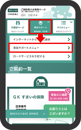 「事故サポートメニュー」をご確認ください。