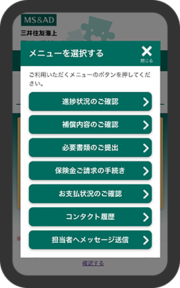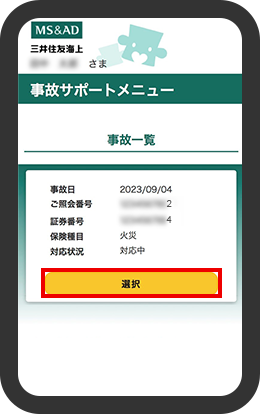 「事故サポートメニュー」を使用する案件を選択