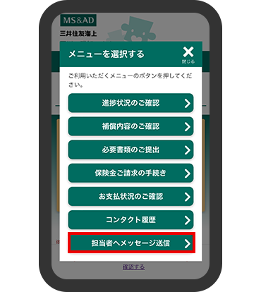 「事故サポートメニュー」から「担当者へメッセージ送信」を選択