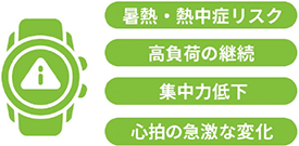 - 作業員の生体データを取得し、熱中症などの予兆を検知すると、作業員と管理者双方にアラートを発信します。