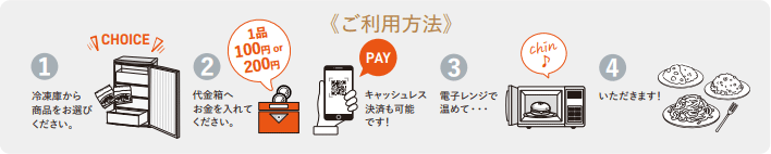 - 企業が月額利用料を負担、従業員はオフィス内に設置された冷凍庫からお好きな商品(100円または200円/1商品)を選んで購入し、いつでも手軽に利用できます。