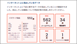 診断スコア・被害想定額・セキュリティ上の課題・インターネット上に流出しているデータ等をレポート形式で提供します。