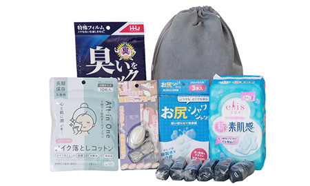下着、メイク落とし、生理用品、防犯アラームがセットになった女性用追加セット。企業で備えておくことで女性従業員は安心して働くことができます。