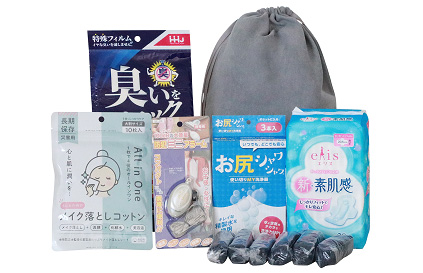 下着、メイク落とし、生理用品、防犯アラームがセットになった女性のための追加セットです。