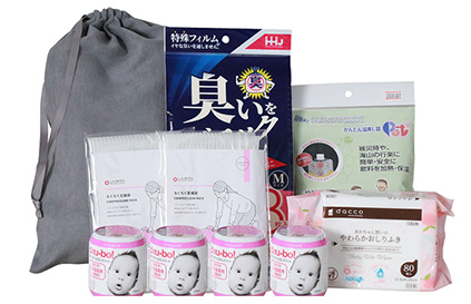 おしりふき、使い捨て哺乳瓶、かんたん湯沸かしキッド、普段使用しているオムツを入れられる圧縮袋がセットになった乳児のための追加セットです。