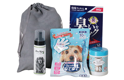 水が要らないペット用ドライシャンプー、歯磨きシート、臭い袋などがセットになったペット用追加セットです。