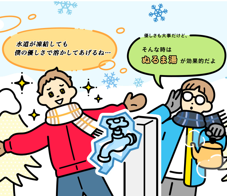 ※注意:熱湯をかけると水道管や蛇口、メーター等が破損しますので絶対にやめましょう。