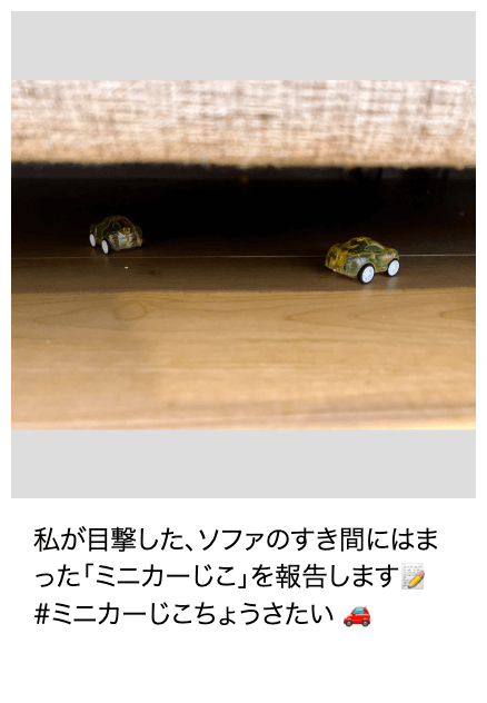 2025年3月2日(日)10:00〜2025年3月16日(日)23:59までに、三井住友海上X公式アカウント (@msins_pr)をフォローし、キャンペーン用フォームにて報告後、フォーム内より立ち上げたポストに対し「 #ミニカーじこちょうさたい 」タグを付け、おもちゃのミニカーに起こったアクシデントの画像添付をし、ポストすることで応募完了となります。