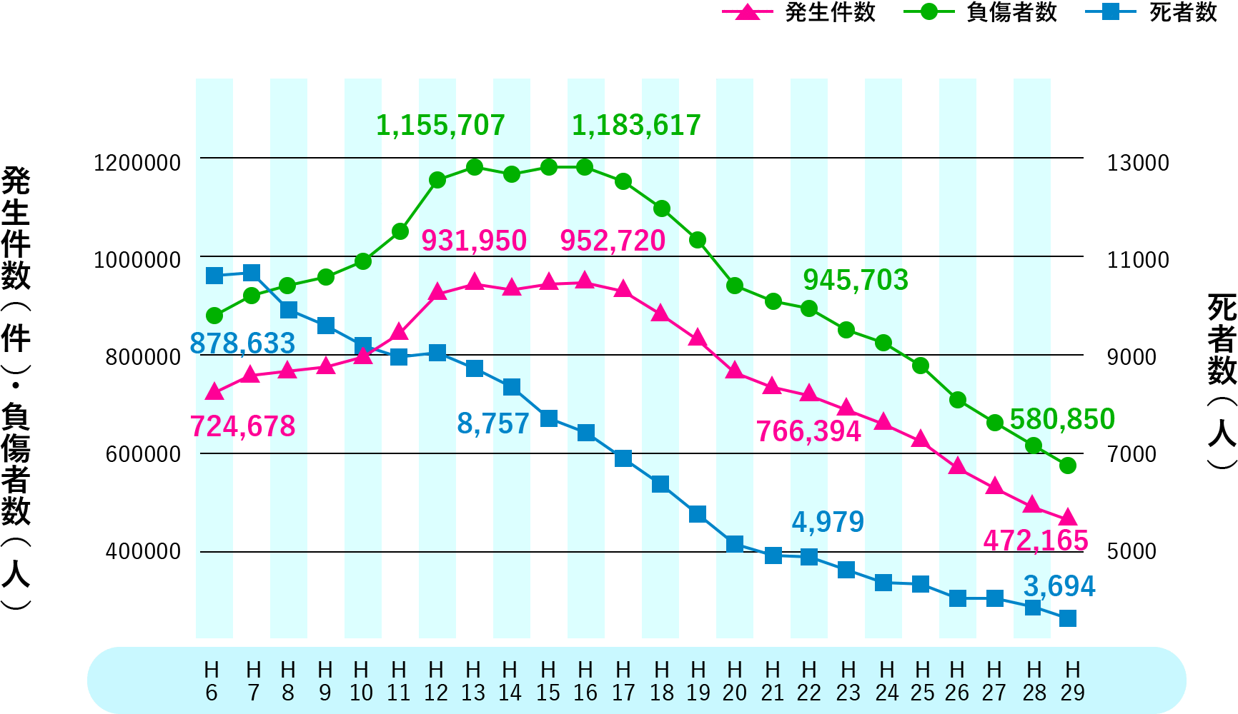 平成29年の人身事故発生件数は約47万2千件で、事故による死者数は約3千7百人、負傷者数も約58万1千人と、13年連続で減少しています。