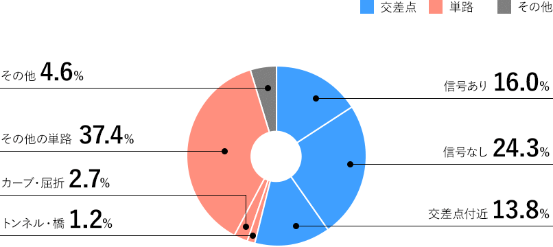 道路形状別では、交差点で約54%、単路で約41%となっており、その割合は前年とほぼ同じです。