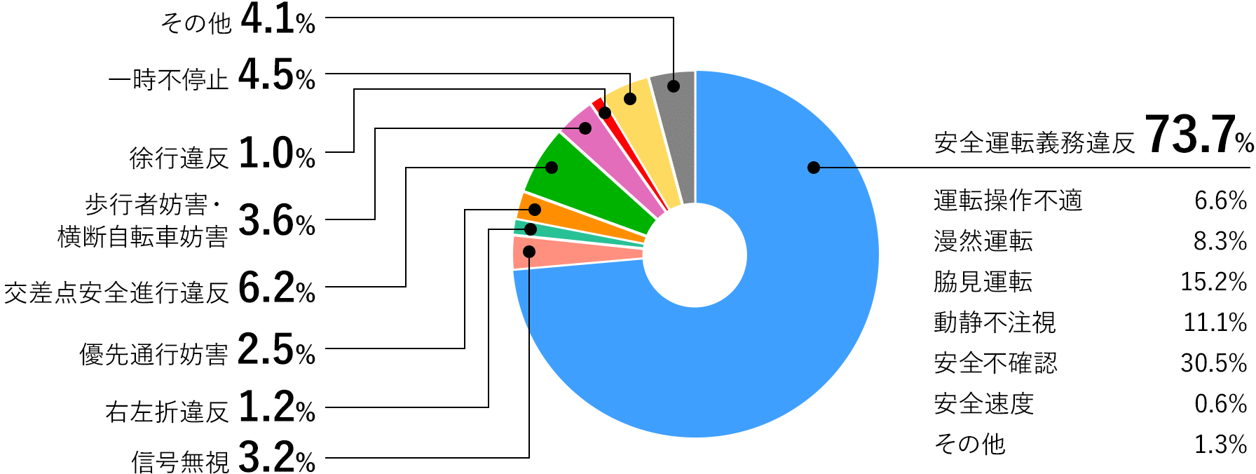 安全運転義務違反の内訳をみてみると約74%中、安全不確認が約31%と多く、脇見運転約15%、動静不注視約11%となっています。これらの事故は十分な注意を払って運転することにより防止できるものです。